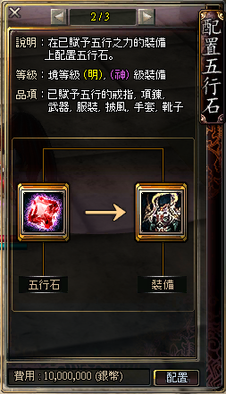 五行石(火)(神) | 擁有提升屬性攻擊力的火之力五行石,可裝備於已賦予五行火屬性的境等級神級裝備。 | [變換五行石]獲得 | ||||