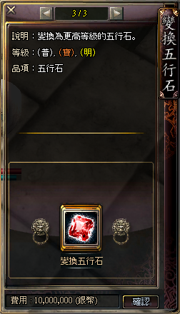 五行石(火)(寶) | 擁有提升屬性攻擊力的火之力五行石,可裝備於已賦予五行火屬性的境等級神級裝備。 | [變換五行石]獲得 | ||||